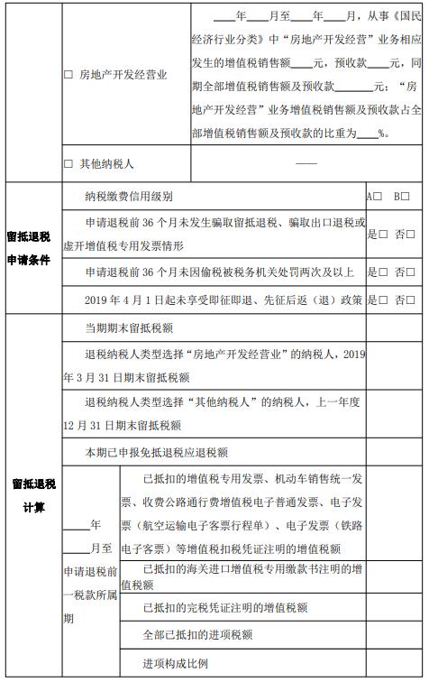 (二)退税纳税人类型选择“房地产开发经营业”的纳税人,2019 年 3 月 31 日期末留抵税额:填写 2019 年3月税款所属期的期末留抵税额。如 2019 年 3 月税款所属期未进