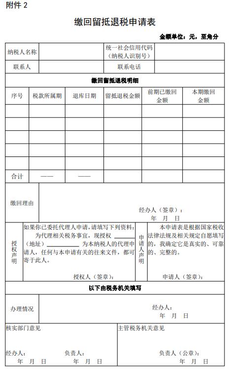 十三、纳税人按照7号公告第九条规定,需要申请缴回已退还的全部留抵退税款的,可以通过电子税务局或办税服务厅提交《缴回留抵退税申请表》(见附件2)。税务机关应当自受理之日起5个工作日内,依申请向纳税人出具留抵退税款缴回的《税务事项通知书》。纳税人在缴回已退还的全部留抵退税款后,办理增值税纳税申报时,将缴回的全部退税款按照规定填写在增值税及附加税费申报表相关栏次,并可以继续按照规定抵扣进项税额。